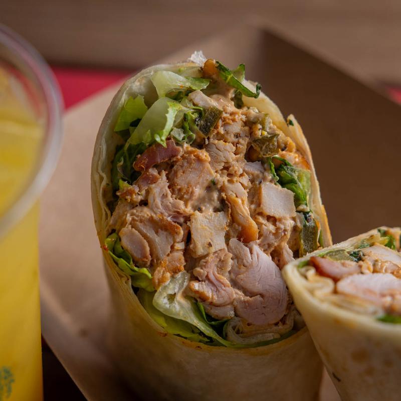Romaine, tomato, and our fresh smoked, pulled chicken salad, (try as salad no wrap)