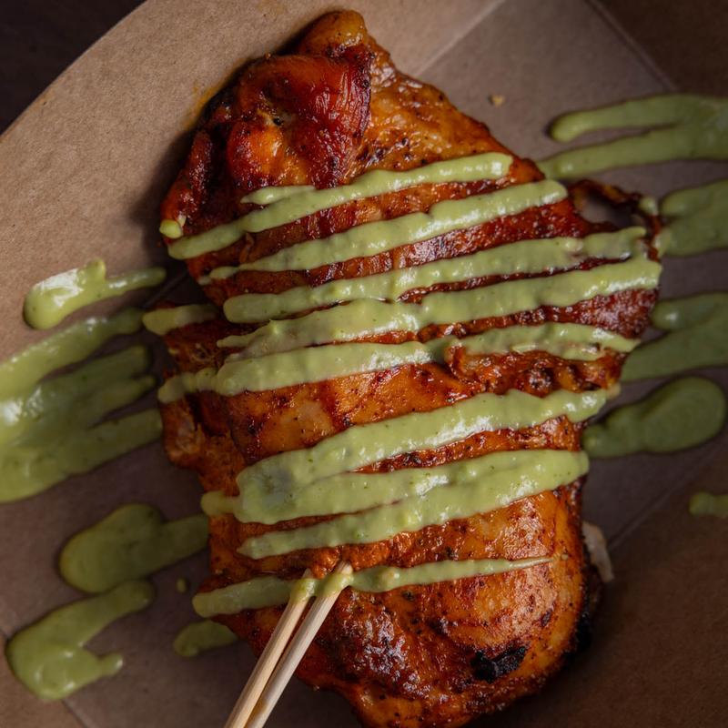 Brined and smoked chicken thigh on a stick, choice of sauce